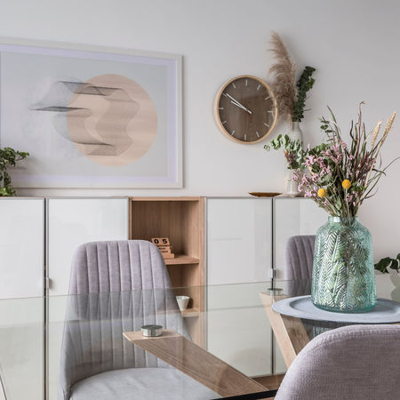 Por un lado, se eliminó una pared divisoria entre el salón y el comedor, usándose el mismo pavimento en todo el espacio para generar una continuidad. Además, se actualizó el mobiliario buscando un estilo nórdico con tonos blancos y cálidos que contrastaban sutilmente con los toques de color azul.
